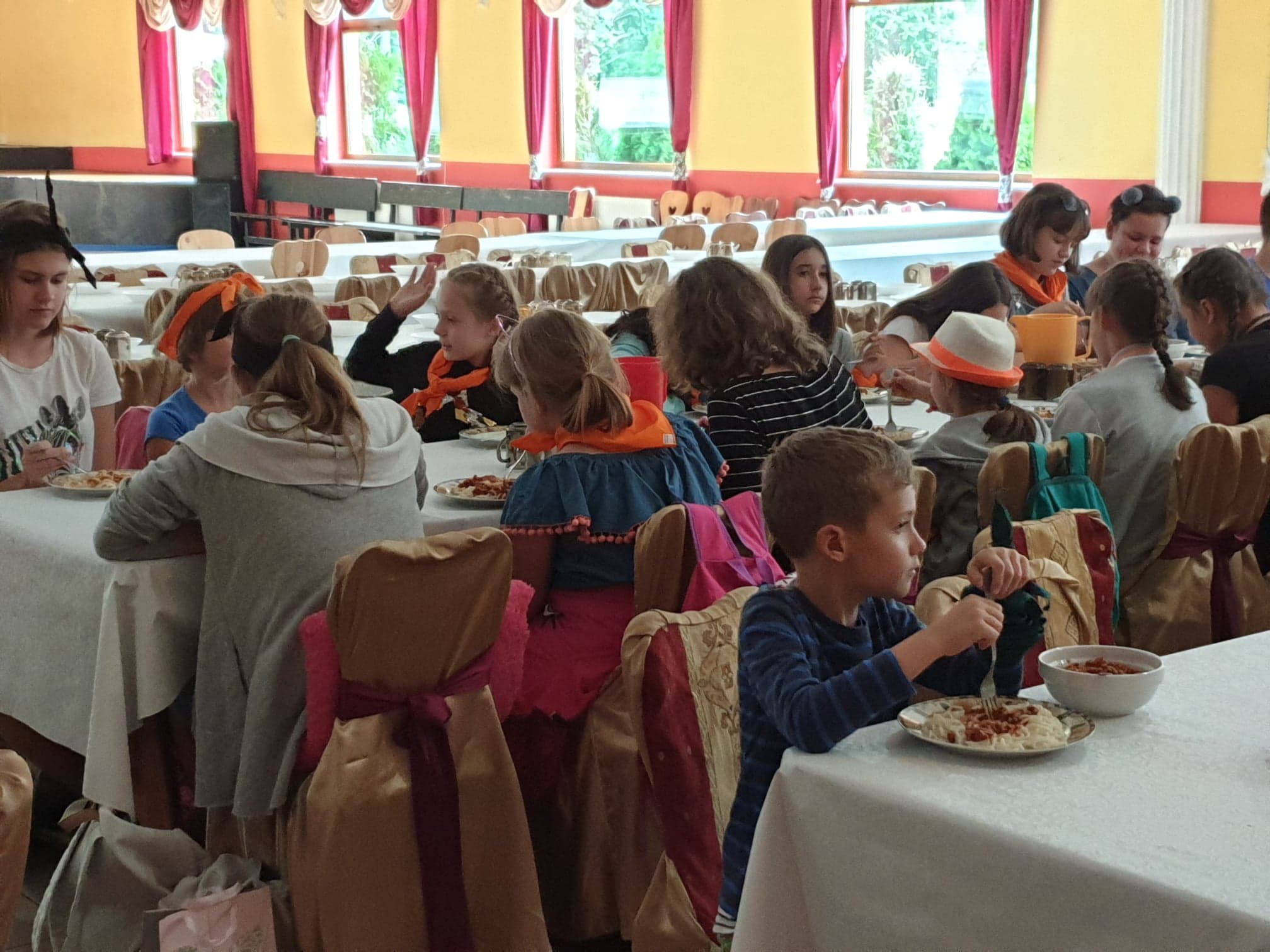 Obiadek (ogórkowa, spaghetti), po obiadku zakwaterowanie (chłopaki pierwsze piętro, dziewczyny drugie – jest git).