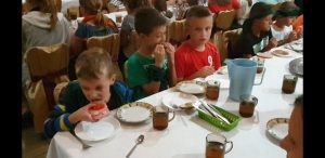 A skoro przy jedzeniu jesteśmy, to mało że jedzą, padają różne rekordy w ilości zjedzonych racuchów: Dominika 10 sztuk plus 2 kanapki i tu wielki szacun, ale wieczorem się jednemu Szymkowi wymsknęło, że jednak to on jest rekordzistą – 21 racuchów – i tu zagadka – który to?