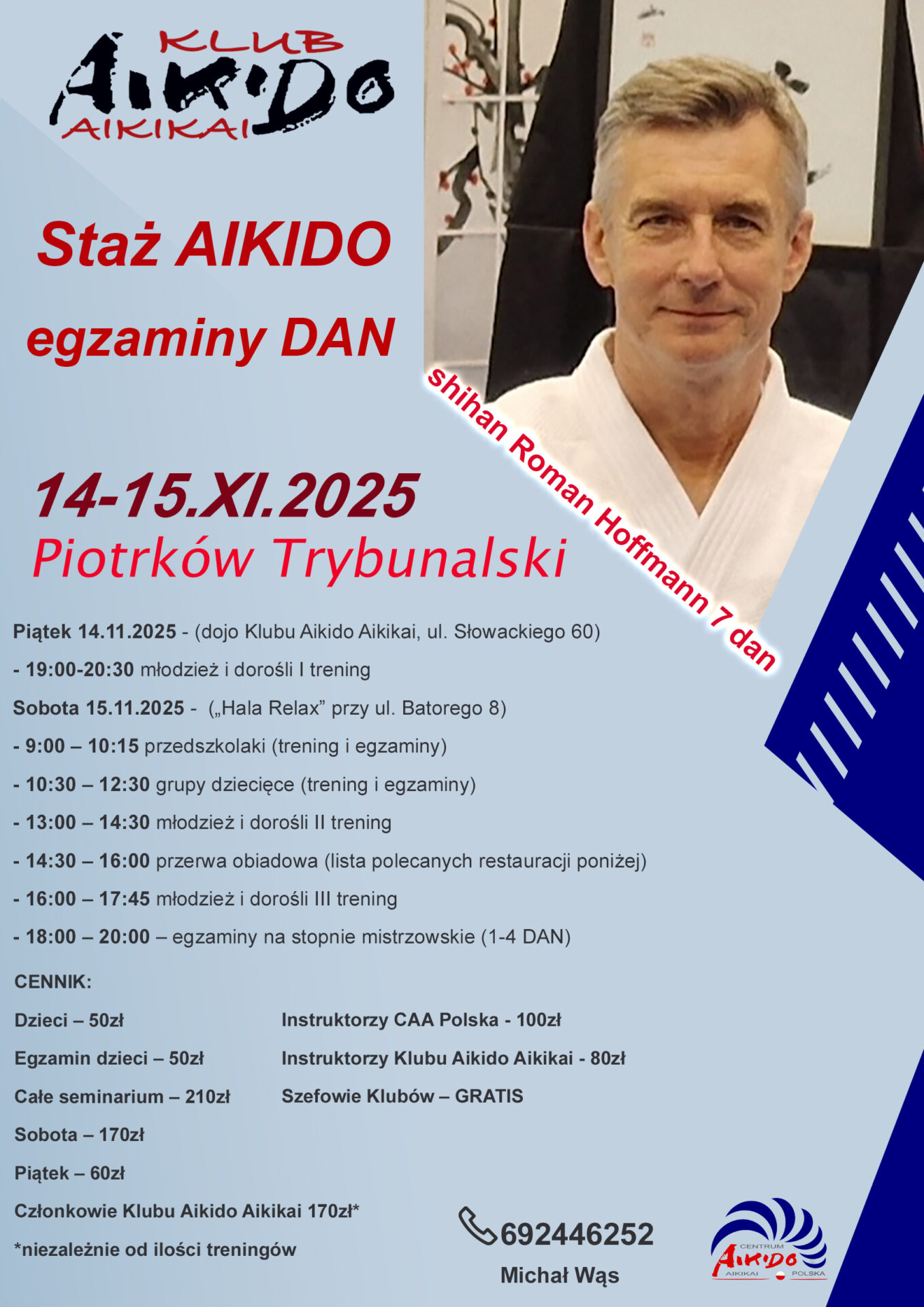 Wszelkie pytania prosimy kierować drogą mejlową na adres: biuro@klub-aikido.com lub telefonicznie: 692446252 – sensei Michał Wąs