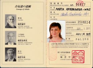 W dniu 10 czerwca 2011 roku zdałam egzamin na 1 dan przed komisją Polskiej Federacji Aikido w składzie: Roman Hoffmann 6 dan – przewodniczący komisji, Paweł Zdunowski 5 dan, Wojciech Brożyński 4 dan (prezez PFA). Podczas majówki pod kierunkiem shihana Hombu Dojo Shoji Seki 8 dan zdałam egzamin na 2 dan, w dniu 4 maja 2013r; przed komisją PFA w składzie: Roman Hoffmann 6 dan – przewodniczący, Agnieszka Potok 4 dan i Grzegorz Kołak 4 dan.
