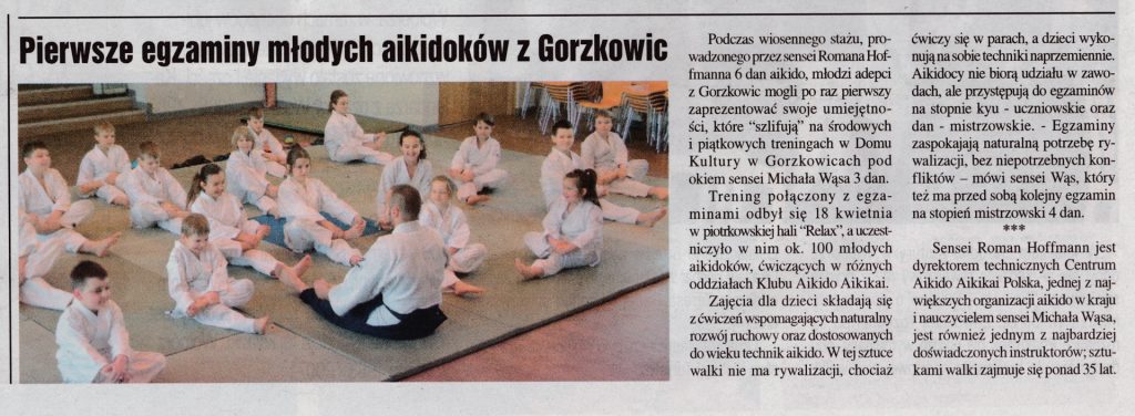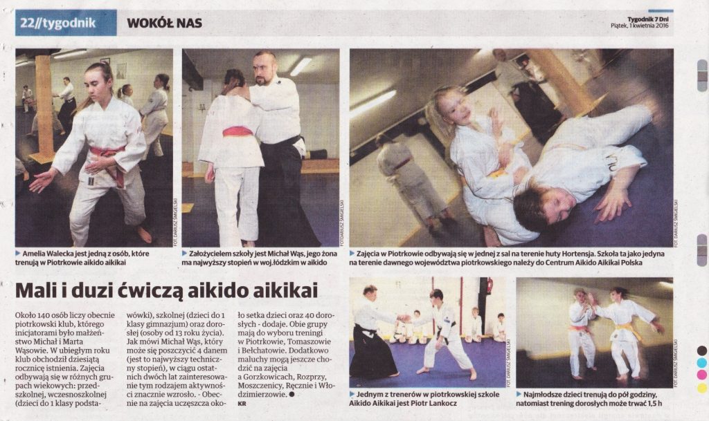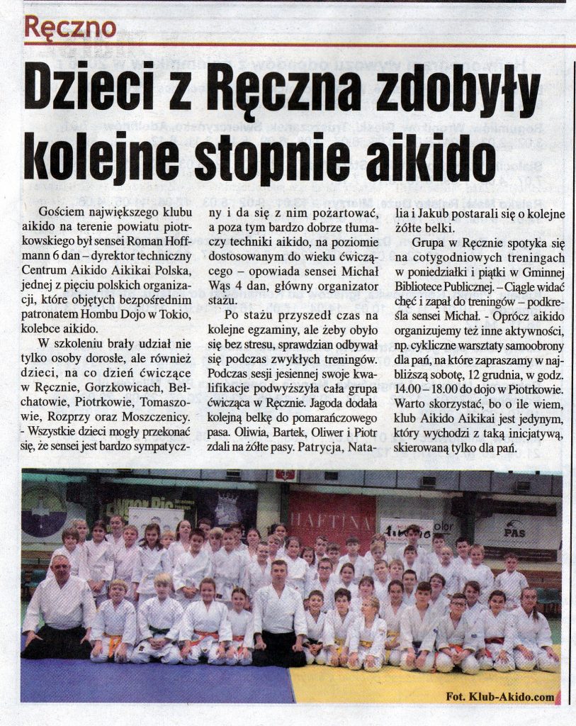 * Na portalu www.epiotrkow.pl ukazał się artykuł „Mistrzowie są w Piotrkowie” relacjonujący egzaminy na stopnie mistrzowskie AIKIDO, zdawane podczas stażu z shihanem Shoji Seki 8 dan z Hombu Dojo przez naszych sensei i klubowiczów: Michał Wąs – 4 DAN, Marta Wąs – 3 DAN, Dominika Cudzich i Piotr Skrobek 1 -DAN.