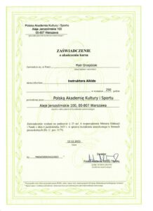 Pierwsze kroki z Aikido zacząłem stawiać w styczniu 2020, kiedy to przyszedłem na zajęcia do klubu Aikido Aikikai prowadzących przez senseja Michała Wąsa 5 dan i sensei Martę Wąs 4 dan. Systematyczne treningi pozwoliły mi się rozwinąć motorycznie jak i mentalnie. Pierwszy egzamin na 6 kyu zdałem 26.06.2020 – egzaminował Michał Wąs. Ostatni egzamin na 1 kyu zdałem 03.04.2024- egzaminował Michał Wąs. Aby dalej się rozwijać i doskonalić uczęszczam na staże prowadzone przez innych sensejów. Swoją pasję do Aikido zacząłem dzielić także z synem który chętnie i regularnie chodzi na treningi.