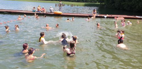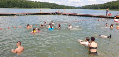 Następnie z racji pogody (zresztą jak zwykle podczas naszych obozów) wybraliśmy się nad jezioro. Niektórzy zostali przy kąpielach słonecznych, ale większość skorzystała z wodnej kąpieli. Była nawet i postać, która wodzie nie odpuściła mimo braku stroju kąpielowego. Zastanawiające jest czemu ktoś się wybrał na Mazury bez wdzianka do wody, rozumiemy że czekan się nad wodą nie przyda, ale kostium jednak tak.